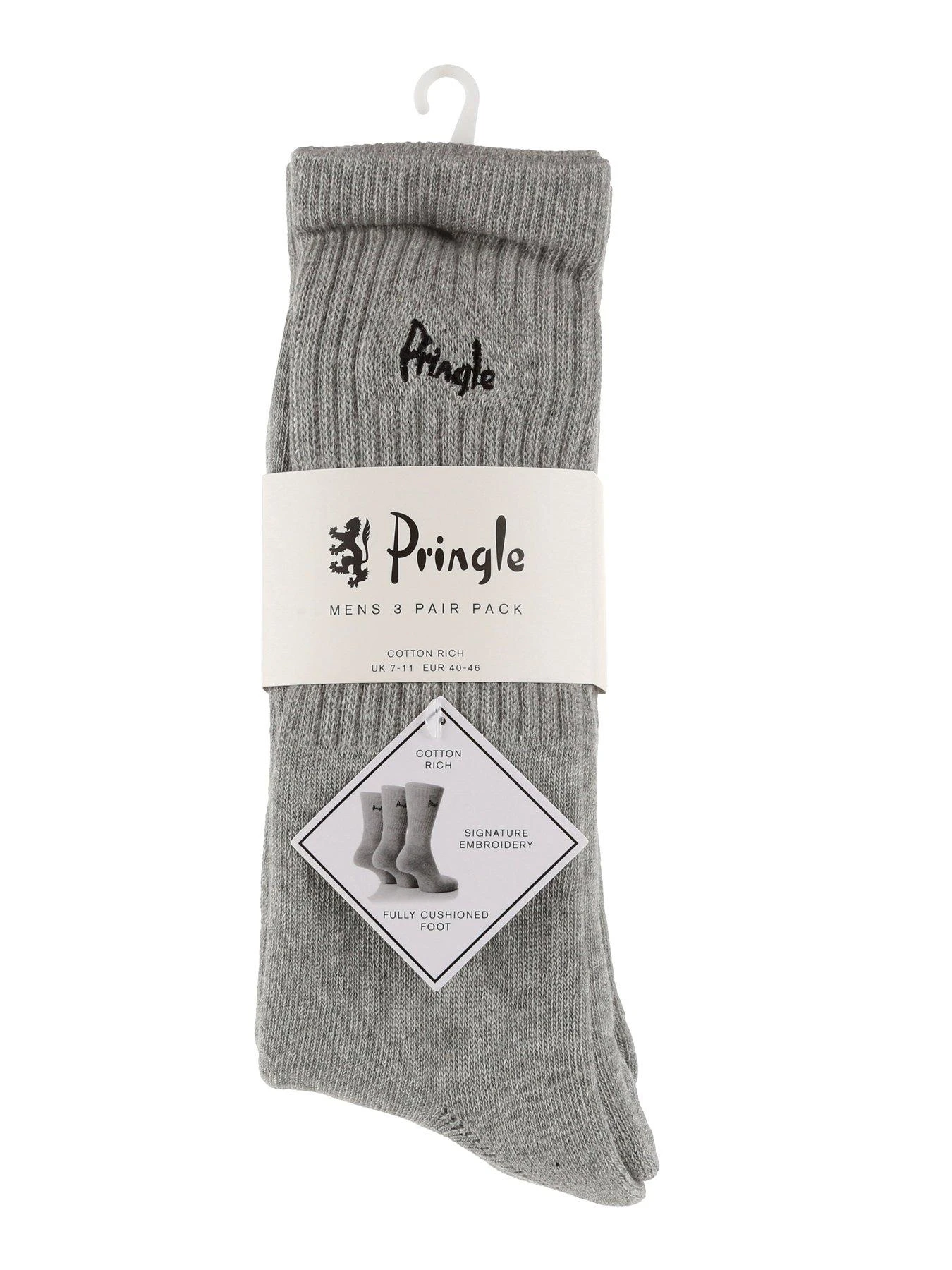 Pringle Men’s Cushioned Sports Socks are classic style crew length socks but with Pringle’s superior quality and performance. These extra-soft combed cotton rich men’s socks offer complete protection with full foot terry loop cushioning and a secure fit with a stretch ribbed leg, with added Elastane for hold and comfort.