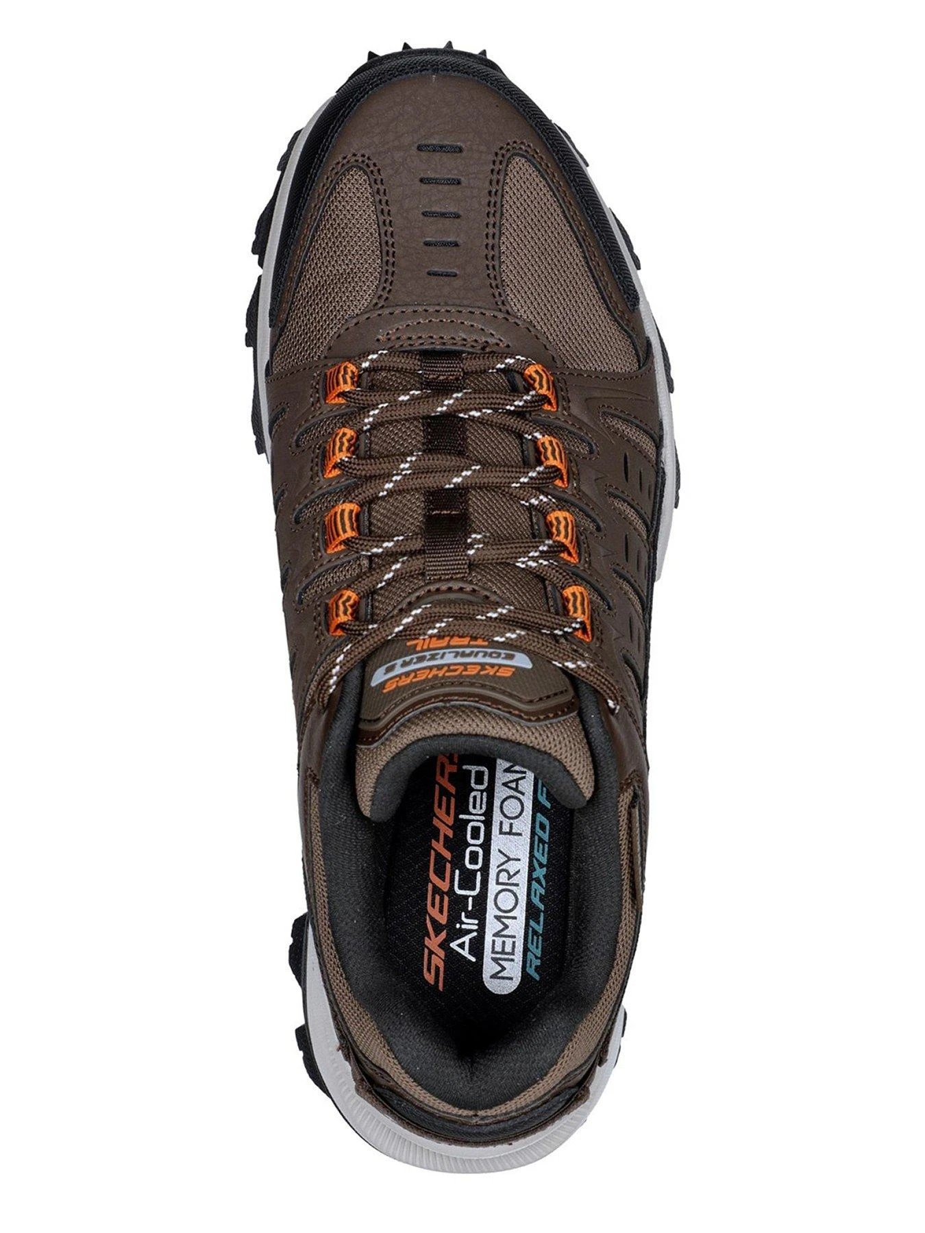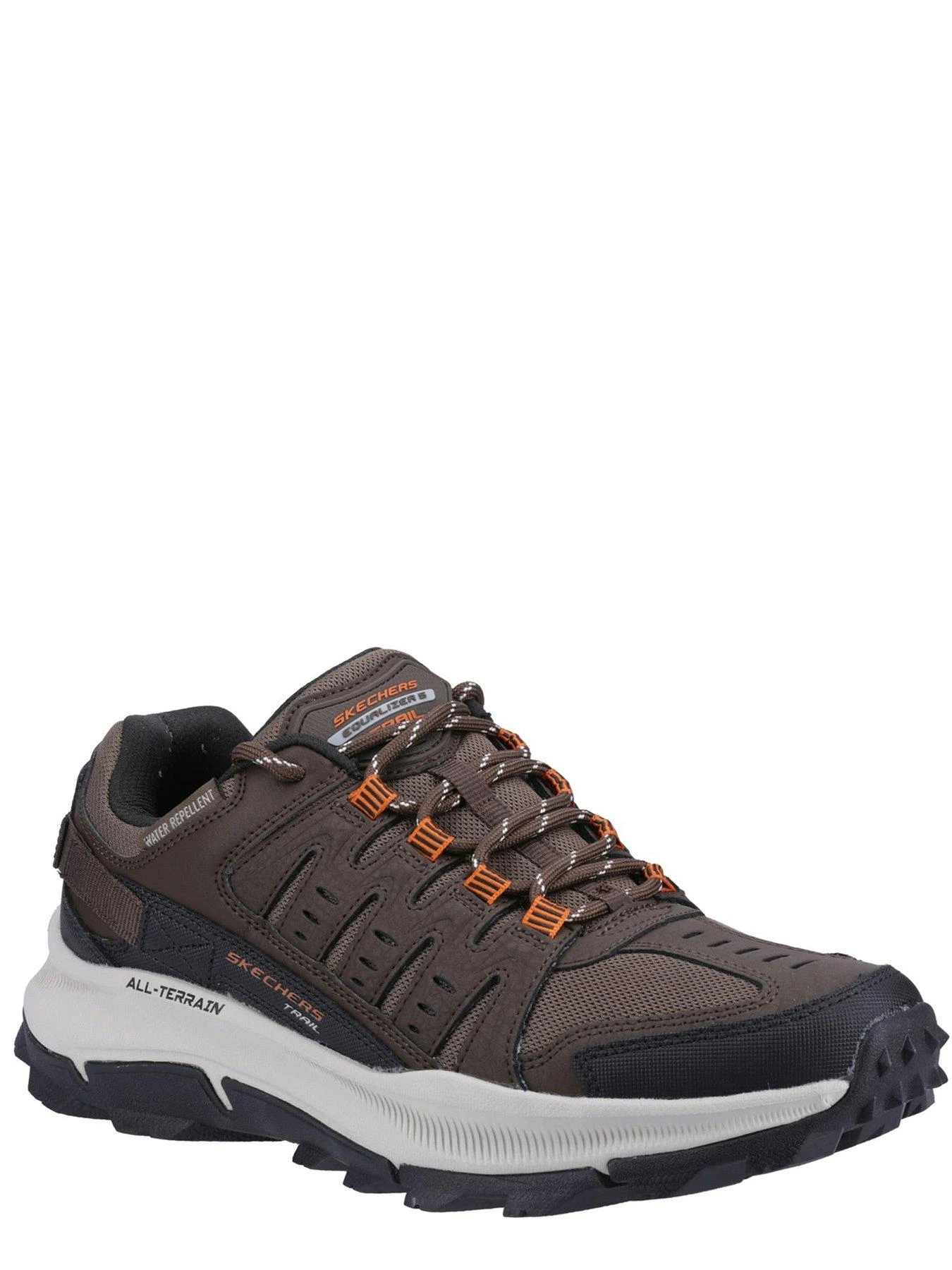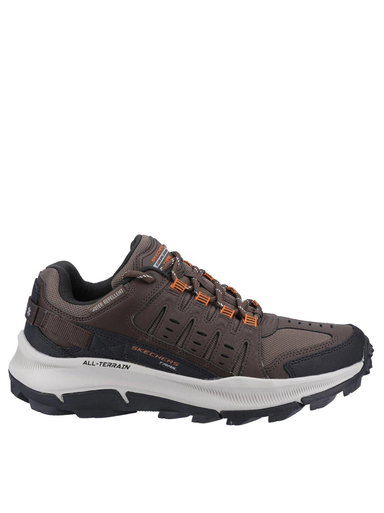 Find comfort in the great outdoors wearing Skechers Relaxed Fit Equalizer 5.0 Trail Solix. This lace-up water-repellent trail design features a durable textile and leather upper with a high-traction all-terrain outsole and a cushioned comfort insole
